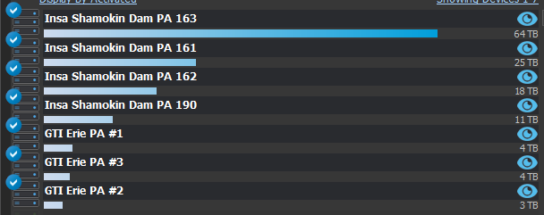 The bridge bar displays information based on the sorting parameter selected. For instance, the default sorting parameter is Total Storage. The bar will show the total storage accumulated compared to other backup bridges displayed on the dashboard. The color of the bar may change, based on the bridge icon status showed as above.