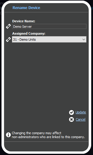 Assigned Company: Links the backup bridge to a company. When a user (non-administrator) is assigned to a company, they will only be able to view devices associated to their company.