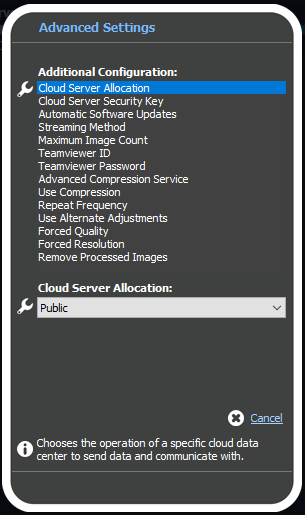 Cloud Server Security Key: Security key encryption information for assigned 'Cloud Server Allocation' setting.