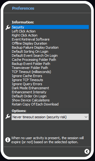 Security: When no user activity is present, the session will expire (or not) based on the selected option.