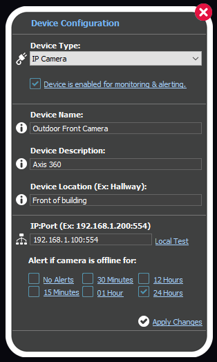 IP & Port or Hard Drive Path: For devices that are IP based, enter the IP address and port of the device to be monitored (Ex: 192.168.1.100:554). For hard drives, enter the drive pathway (Ex: D:\)