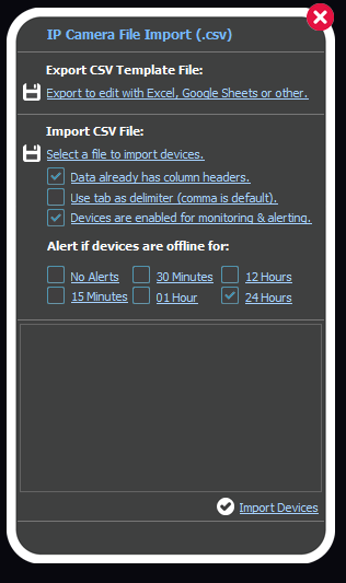 Select a file to import devices: Imports the template with your list of cameras edited from Microsoft Excel or Google Sheets. (Make sure the file is not already opened with Microsoft Excel, or it will not import any data.)